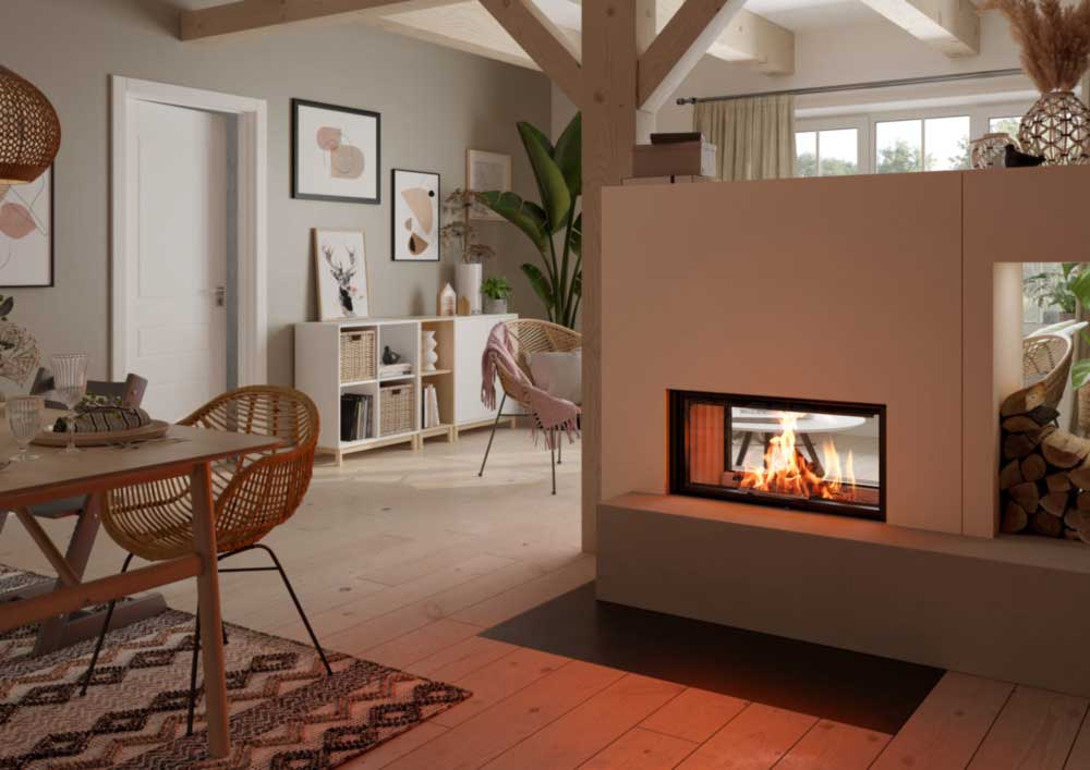 Kamin mit Durchsicht: Kamineinsatz Varia AS-FDh mit verdecktem Scheibenrahmen, seitlich eingefasste, 4-seitig bedruckte Glaskeramik, mit Griff.