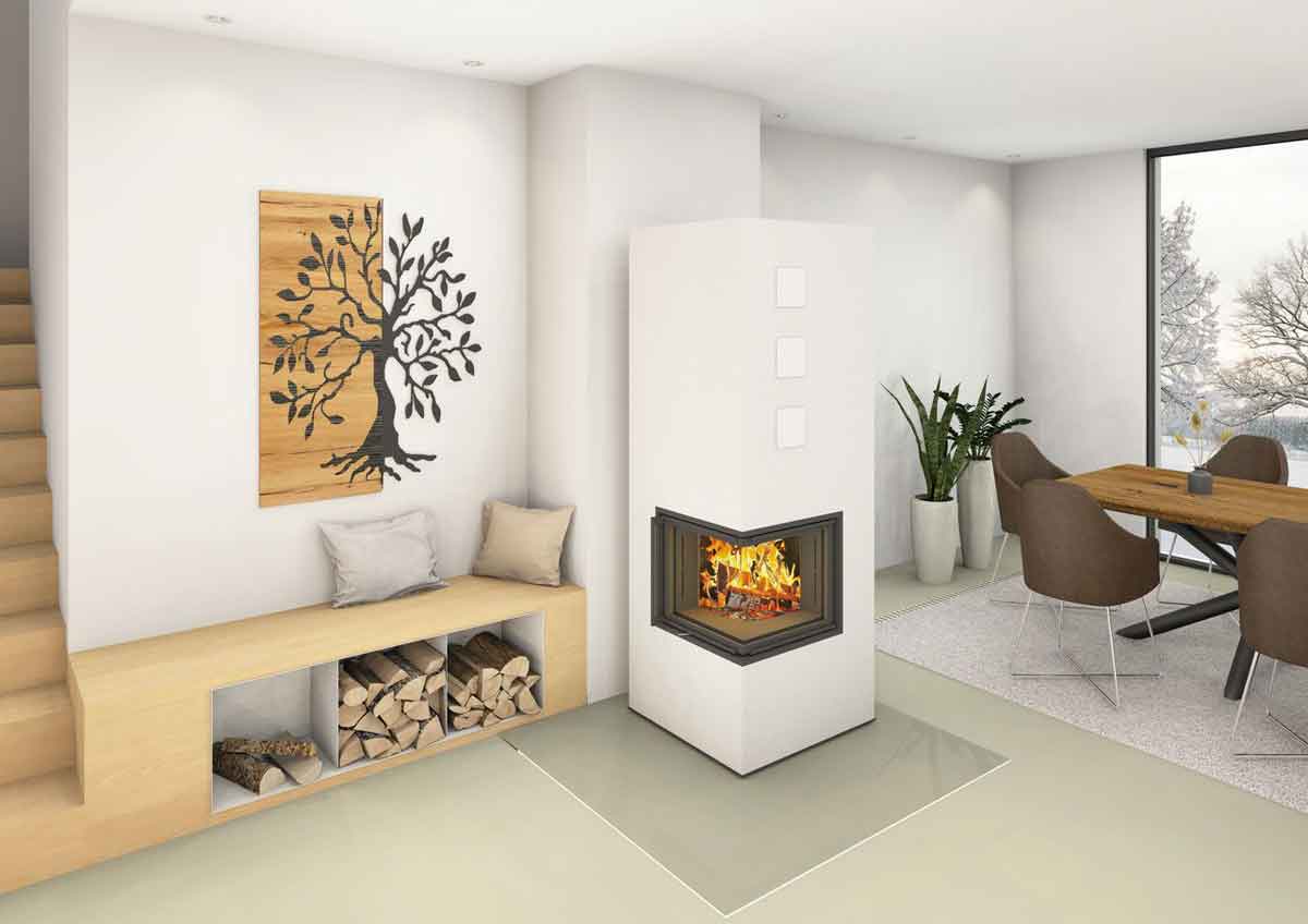 Lieferumfang: Feuerraum komplett, Typ B Plus 90° mit Feuerraum-Podest, Außenhülle aus BRULA Wärmespeicherplatten, 1 Sack FF-Rapidhaftmörtel 20 kg, 3 Sack Brillantputz weiß 1 mm Körnung (20 kg)