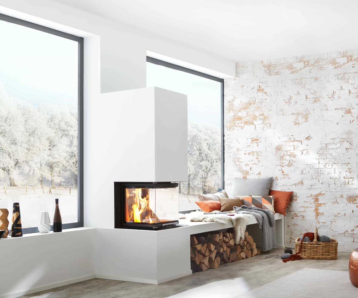Des Weiteren können die Verkleidungselemente in der Höhe erweitert werden. Raumhohe Ausführungen haben eine Wärmedämmung zur Raumdecke und bauseits erstellte Warmluftaustritte. Wenn die Systemverkleidung baulich erweitert werden soll, können mit BRUNNER Kaminbauplatten sämtliche Ideen und Vorstellungen realisiert werden. Der Abstand zur Anbauwand lässt sich mit am Kamineinsatz montierten Hitzeschutzblechen (Zubehör) minimieren.