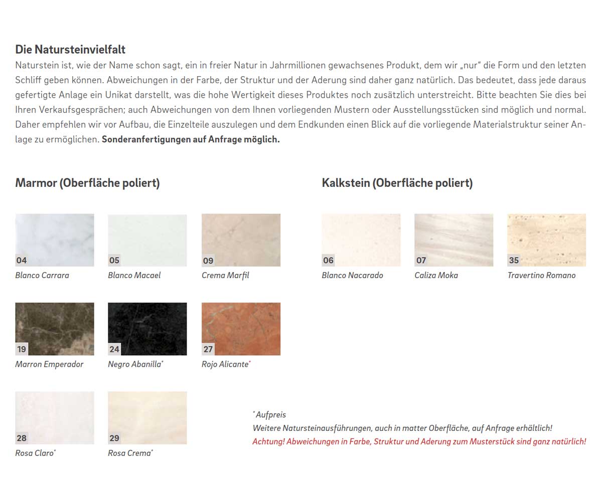 Standard-Sorten poliert: Blanco Carrara, Blanco Macael, Blanco Nacarado, Caliza Moca, Crema Marfil, Marron Emperador, und Travertino RomanoSorten mit Aufpreis poliert: Rosa Claro, Rosa Crema, Negro Abanilla und Rojo Alicante