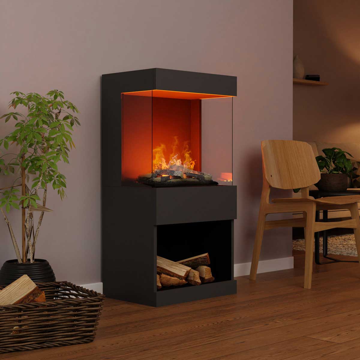 Der Glow Fire OGF 2 Elektrokamin verbindet modernes Design mit innovativer Technik und wird so zu einem zentralen Blickfang in jedem Raum. Unten mit einem "Holzfach" um die Illusion perfekt zu machen. Seine vielseitigen Funktionen und sein realistisches Flammenbild machen ihn zur perfekten Wahl für gemütliche Abende.