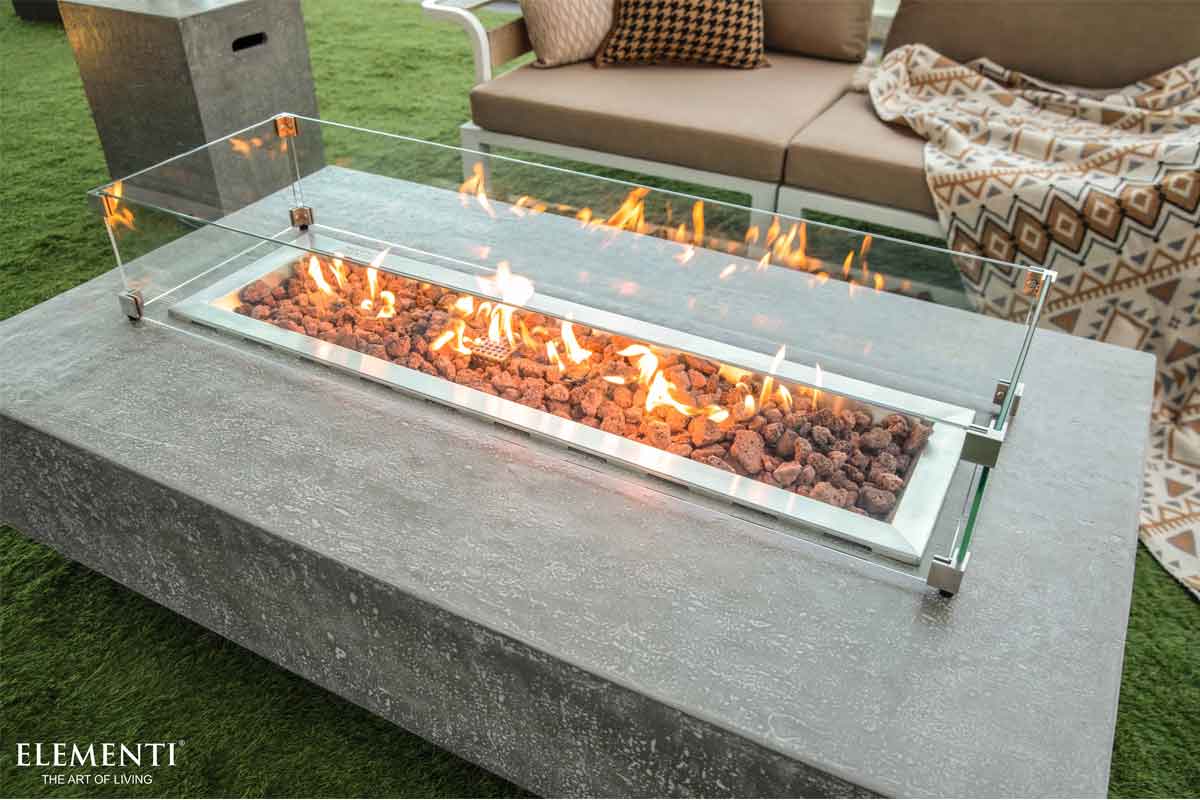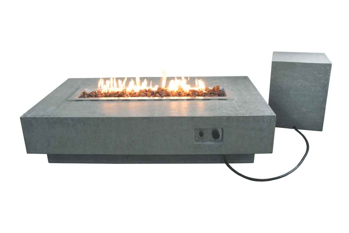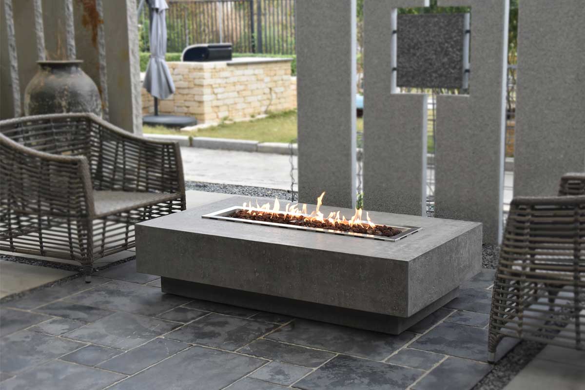 ECHTES FEUERSPIEL AUF KNOPFDRUCKGasfeuerstelle Hampton aus der Elementi-Serie, Beton-Optik Faserbeton inkl. Druckminderer, Anschlußleitung und Lavasteine rötlich, Anschluss an externe Gasquelle