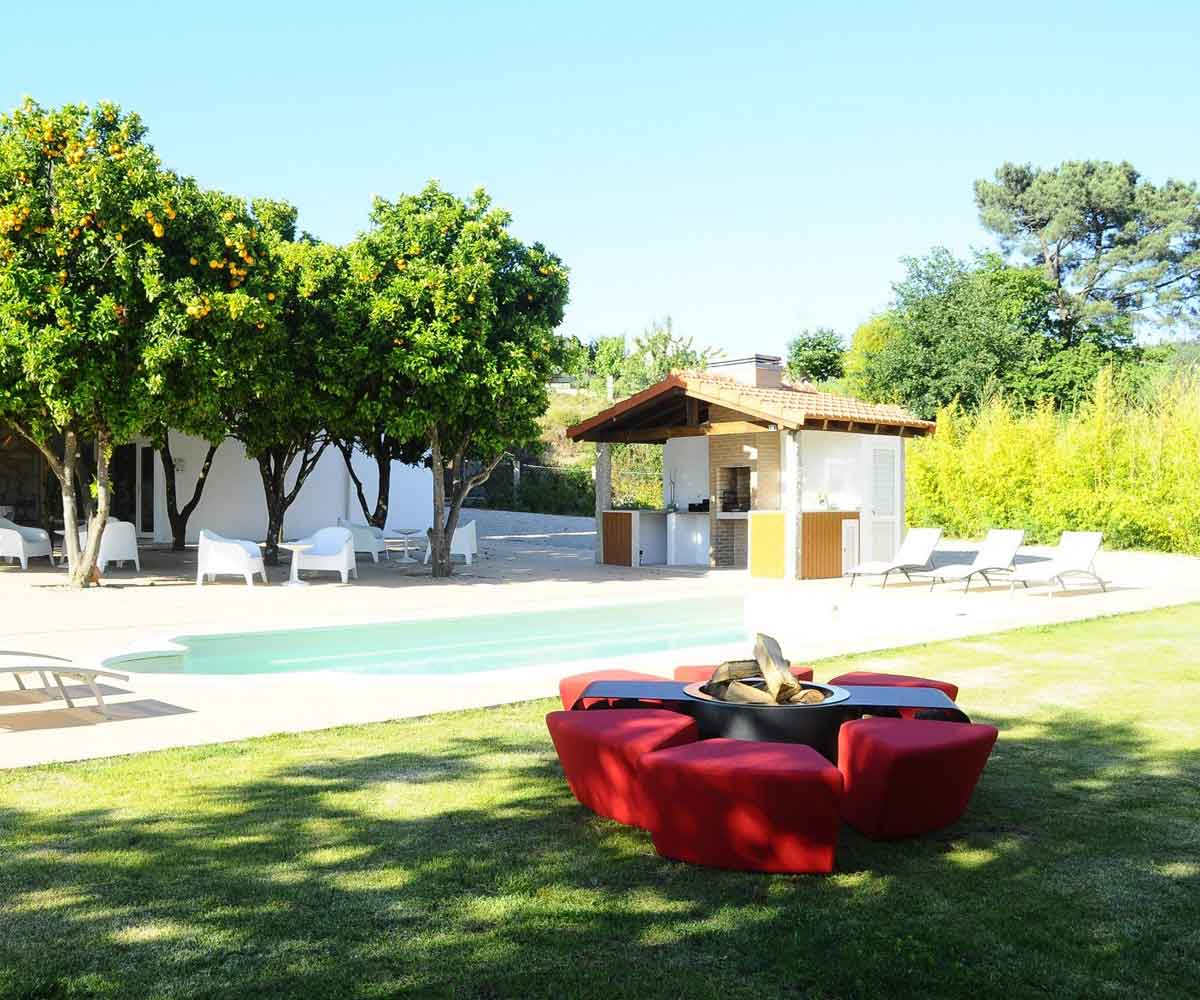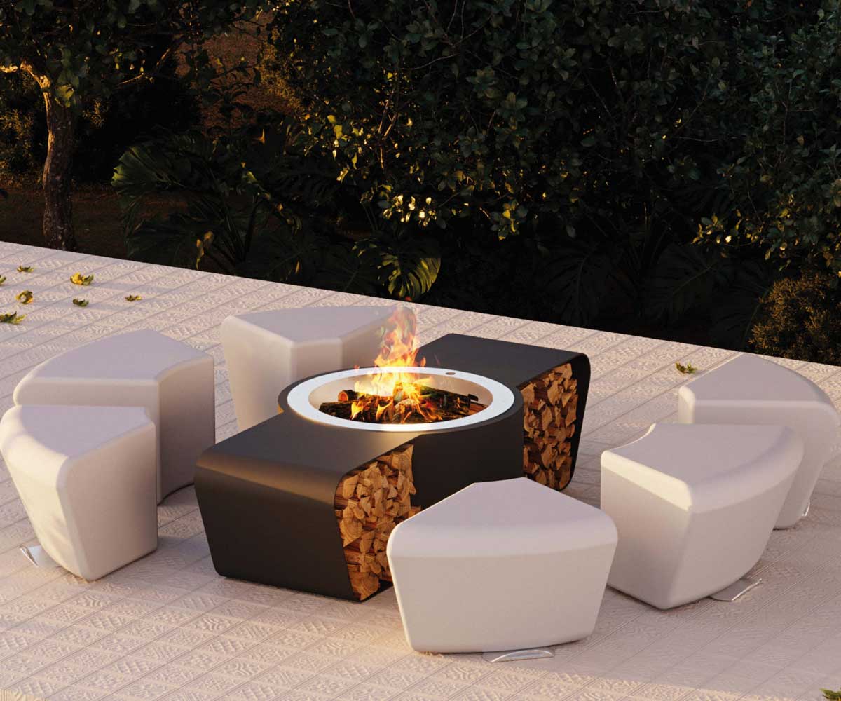 Geselliges Konzept: sechs Sitze rund um die Feuerstelle, die flexibel angeordnet oder bei Nichtgebrauch nahe an die Feuerstelle geschoben werden können. Holzlagerfächer vorhanden – alles griffbereit.