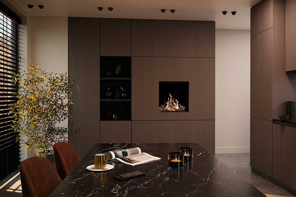 - Großzügiges Design: Der Maestro 60 Eco Wave bietet sich vor allem für kleinere Räume an. Der Kunde kann das Interieur an den persönlichen Stil anpassen, ob in edlem Schwarz, rustikalem Backstein oder verspiegeltem Ceraglas, das die Flammen zusätzlich reflektiert und verstärkt.