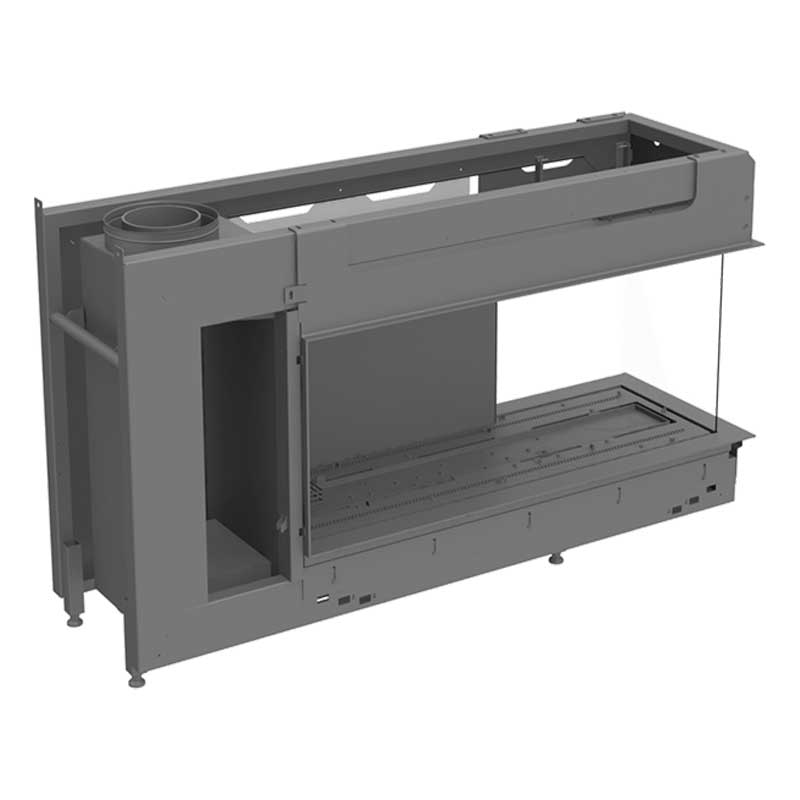 Ein luxuriöser 3-seitiger, rahmenloser Gaskamin, der eine Kreuzung zwischen einem Tunnel- und einem Eckkamin darstellt. Dieser Kamin mit der Auswahl zwischen Brennebenen mit Scheiten oder Kieseln wurde entwickelt, um in einem Raumteiler installiert zu werden, sodass er von beiden Seiten sichtbar ist und sowohl eine Wärmequelle als auch einen interessanten architektonischen Blickfang darstellt.