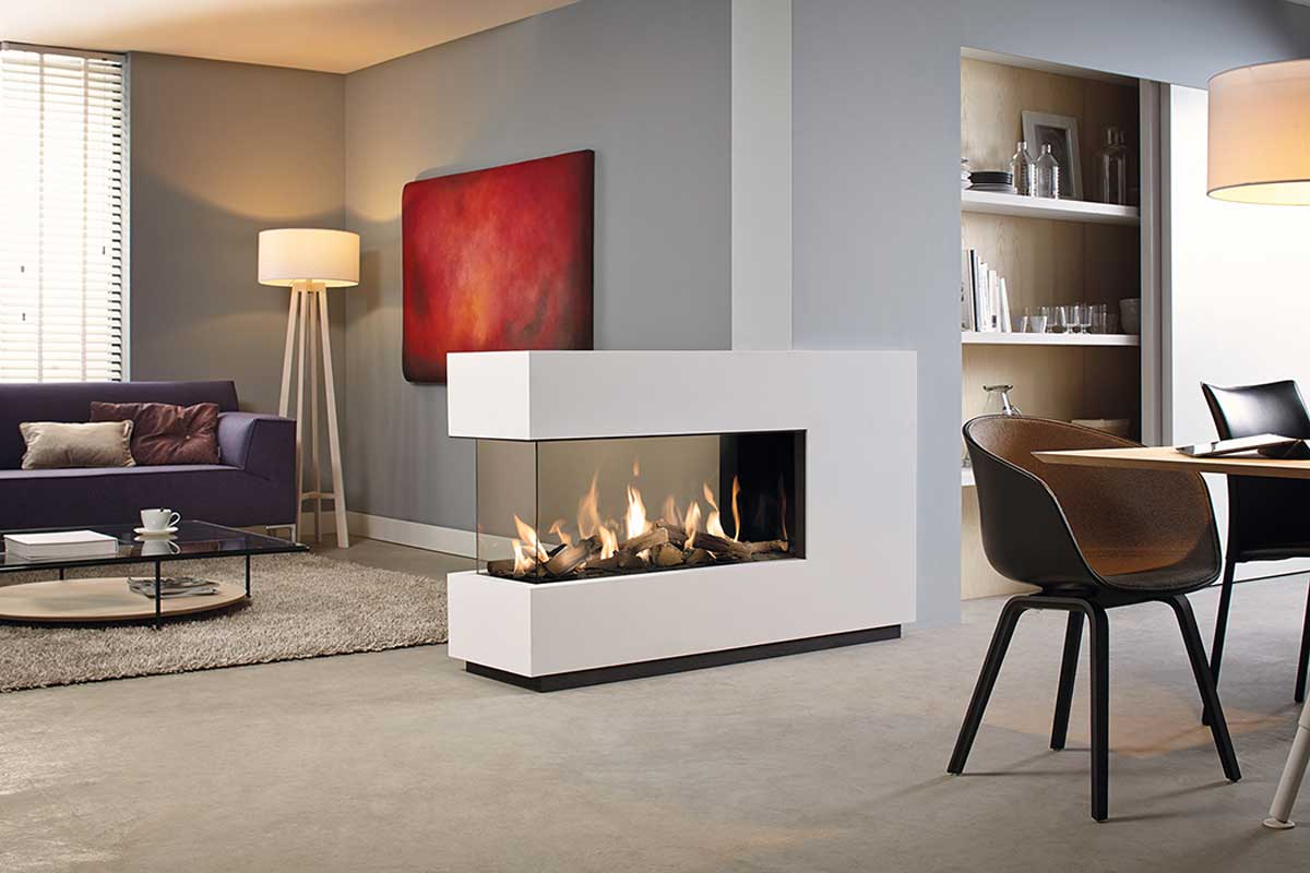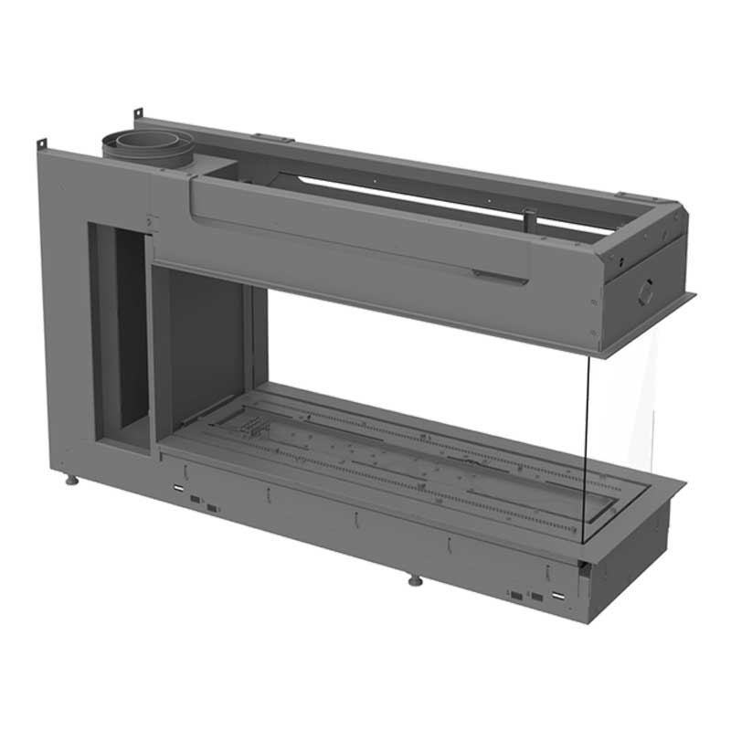 Mit diesem U-förmigen Gaskamin können Sie Ihren Wohnraum aufteilen und dennoch den Luxus eines warmen, realistischen Holzfeuers genießen, wo immer Sie auch sitzen mögen. Er verfügt über ein großzügiges Fenster mit einer Glashöhe von 41 cm. Außerdem wartet er mit neuen realistischen Brennebenen mit braunen Holzscheiten, weißen Steinen oder anthrazitfarbenem Glas sowie Interieurs in verspiegeltem Ceraglass, in Schwarz oder verripptem Gusseisen auf.