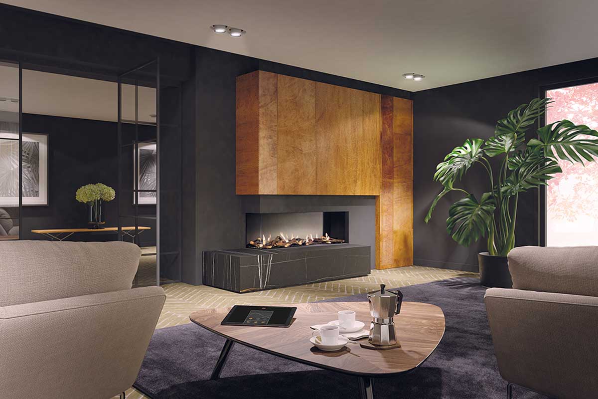 Metro 130XT/2 Eco Wave ist ein ausladender, 2-seitiger raumluftunabhängiger Gaskamin. Er kann als Blickfang in einer Raumtrennwand eingesetzt werden und ein gewöhnliches Wohnzimmer in eine warme und dramatische Umgebung verwandeln. Er ist mit Brennebenen mit natürlichen Scheiten oder Carrara-Steinen sowie als Stadtgas- oder Propanversion und mit erhöhten Kaminböden mit falschen Kaminsimsen.