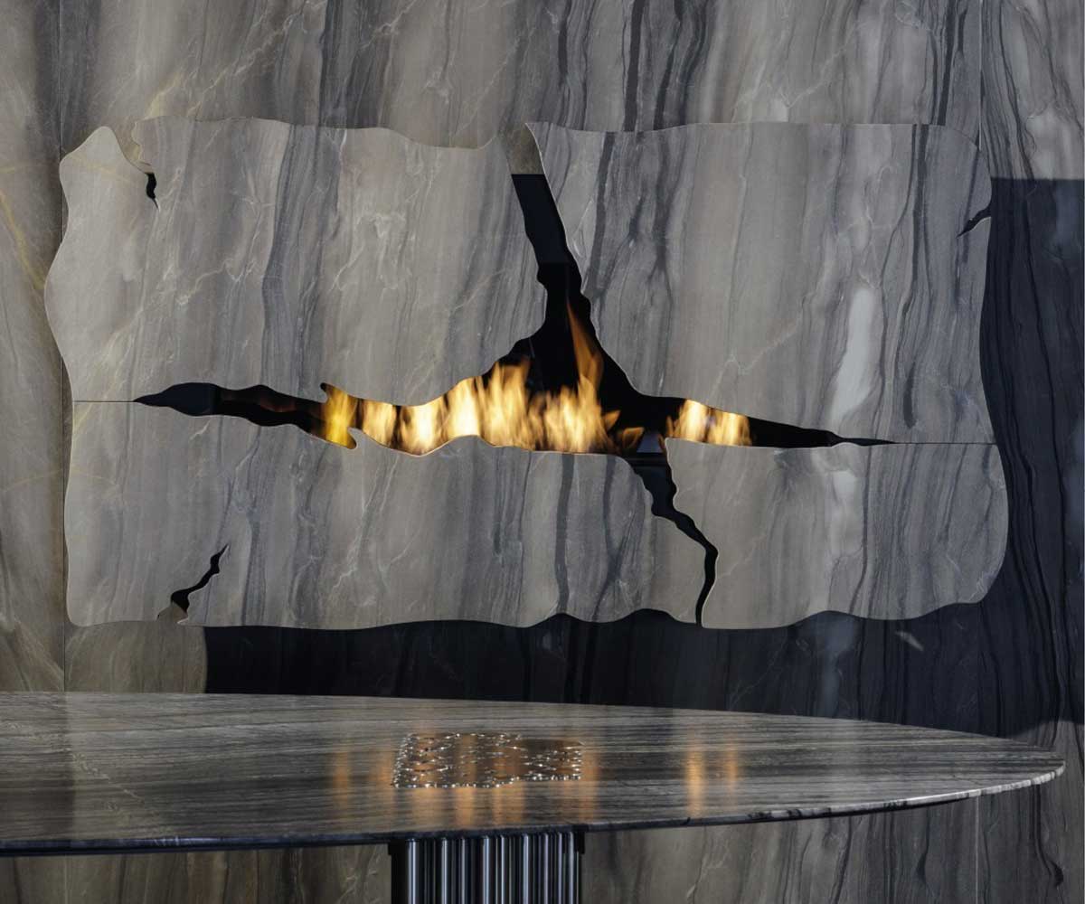 GlammFire Apollo IV EVOPlus, der elegante Bioethanol-Wandkamin mit charakteristischer, „gesprungener“ Oberfläche, der echtes Feuerdesign mit moderner Technik vereint.