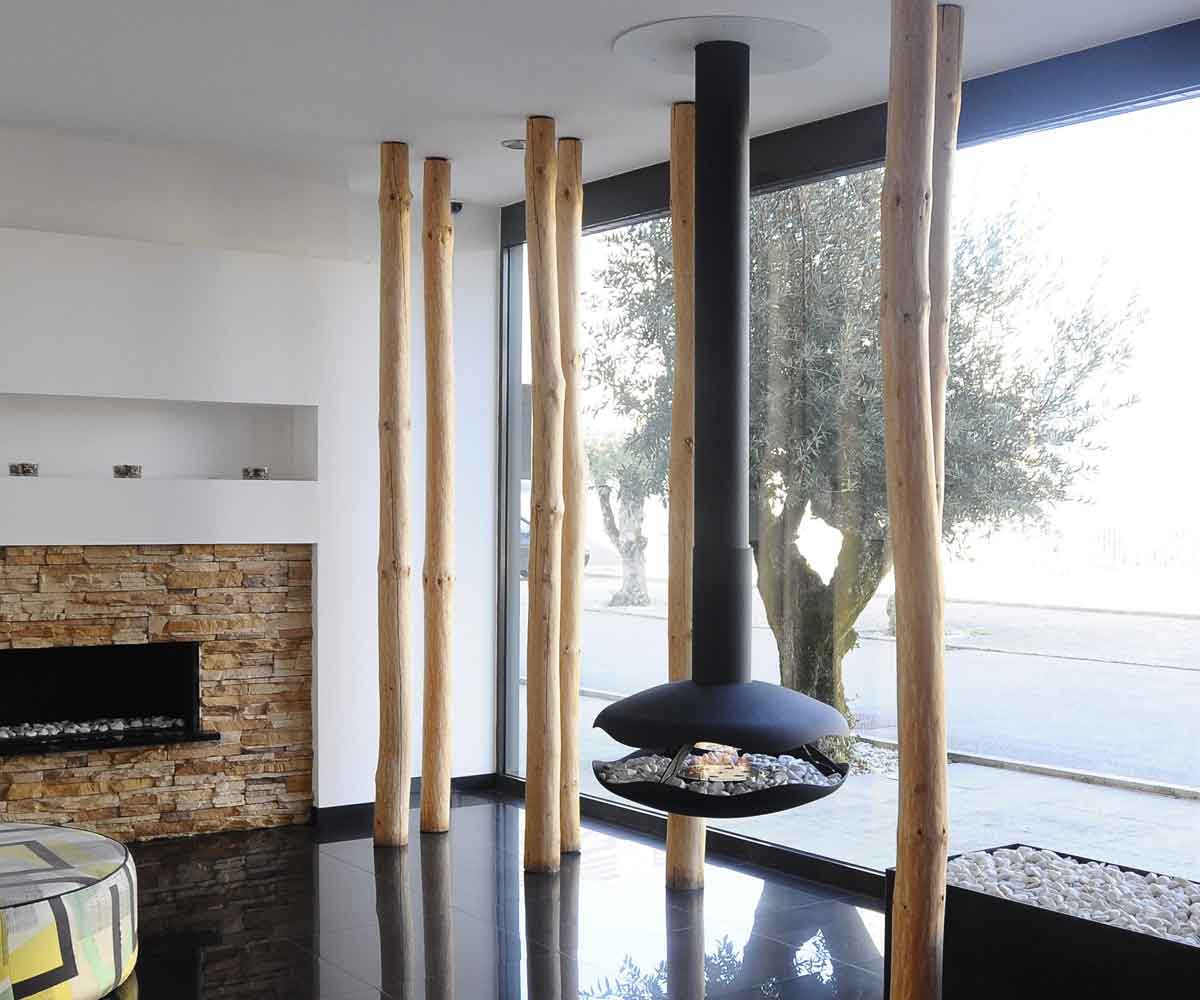 GlammFire Perola – ein eleganter, deckenhängender Kamin mit minimalistischer Formgebung und hochwertiger Verarbeitung.