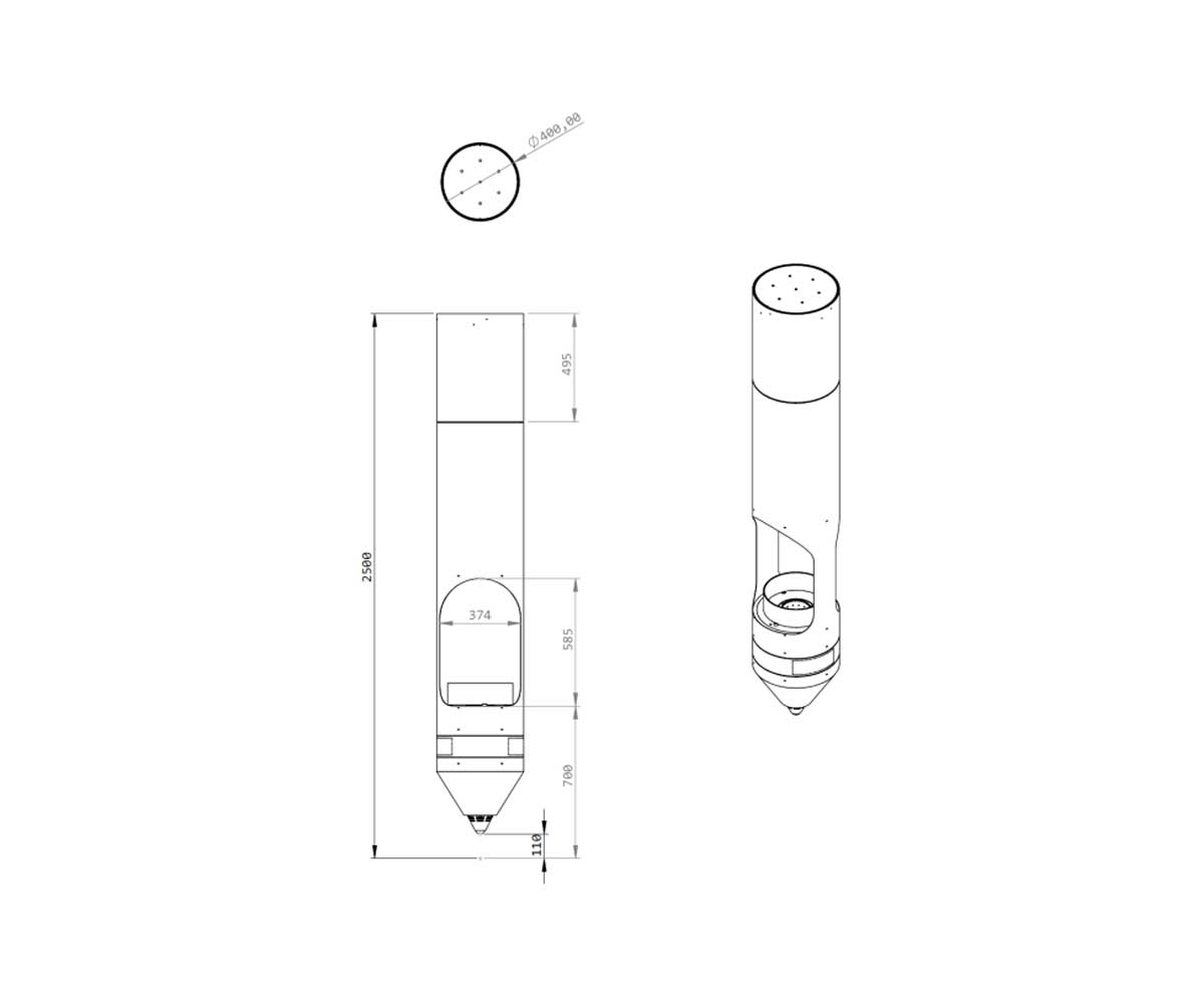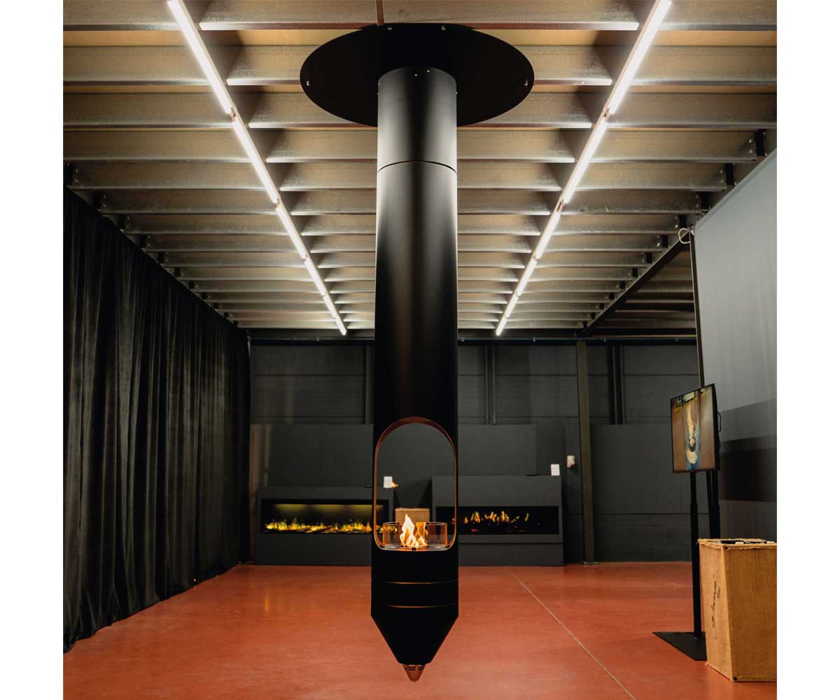 Elegantes Stift-Design: Der hängende Kamin erinnert an einen edlen Füllfederhalter – minimalistisch, raffiniert und luxuriös – und wird so zum zentralen Blickfang im Raum