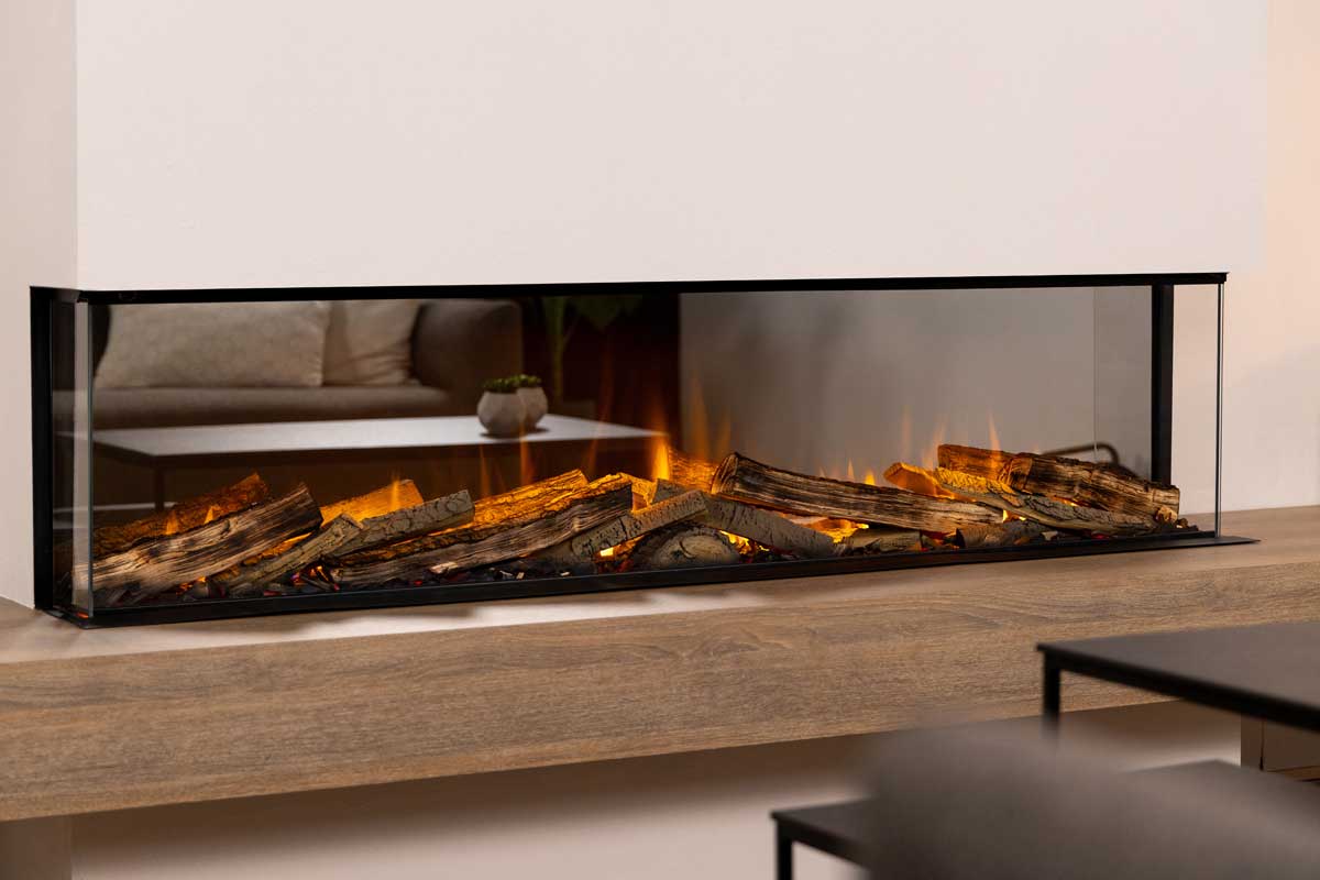 - Konfigurierbar als 1-, 2- oder 3-seitiger Kamin, um sich perfekt in jeden Raum und jede architektonische Gegebenheit einzufügen.