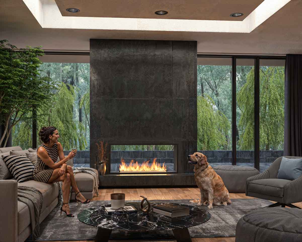 - Dank eines elektronischen Steuerungssystems erfolgt das Anzünden und Löschen der Flamme vollautomatisch – ein Knopfdruck auf der Fernbedienung oder dem Touchpanel genügt.