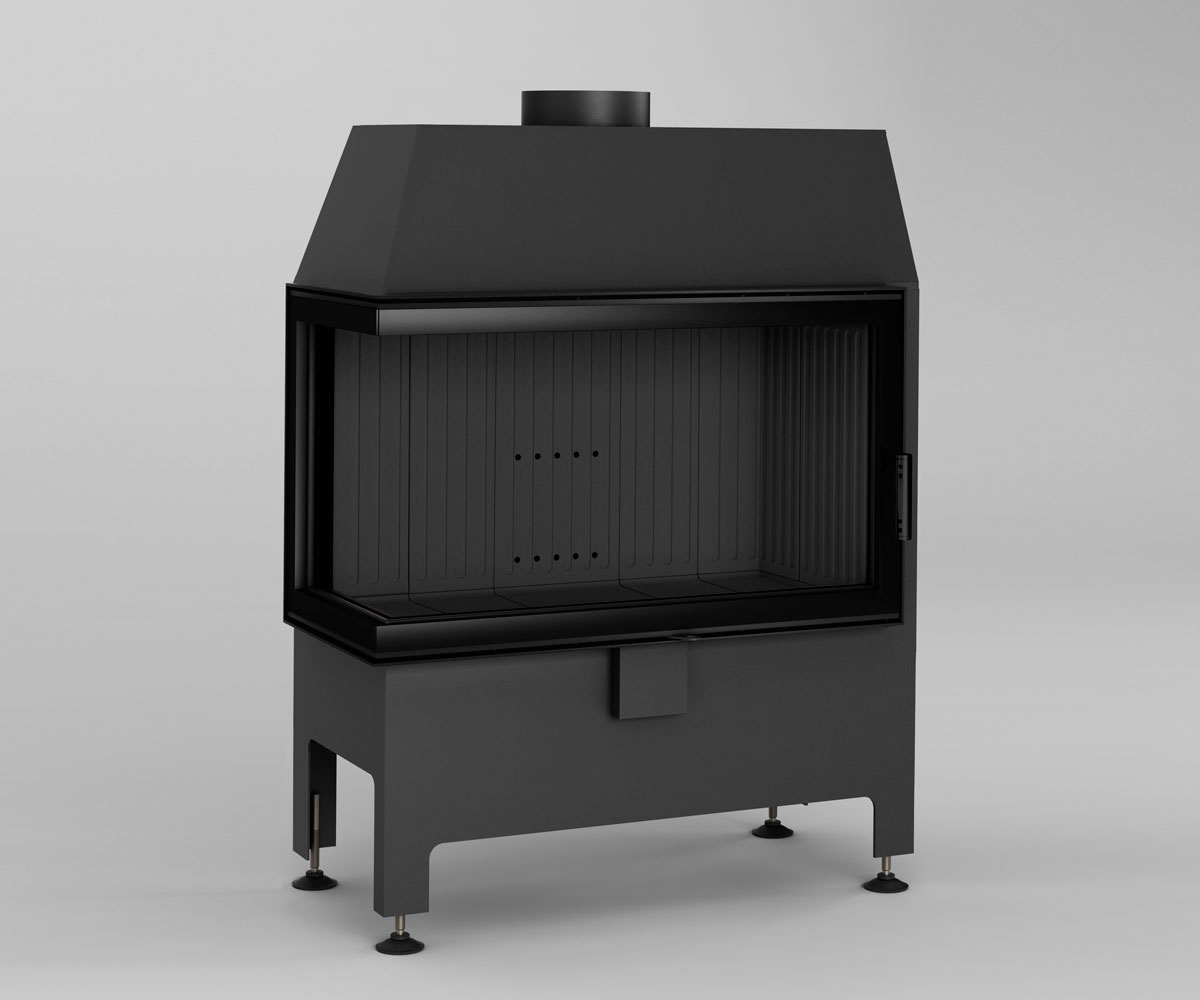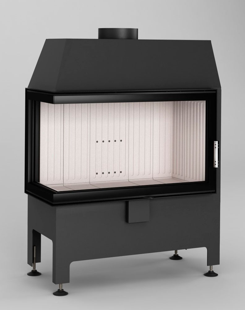 Stahl-Kamineinsatz mit spezieller Akkumulations-Keramik innen und einem belüfteten Bediengriff.