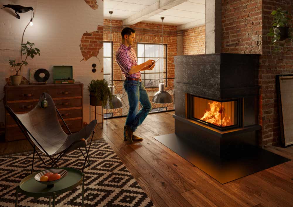 Mit Sicht von 2 Seiten: Kamineinsatz Varia 2R-80h mit verdecktem Scheibenrahmen, seitlich eingefasste, 4-seitig bedruckte Glaskeramik, mit Griff.