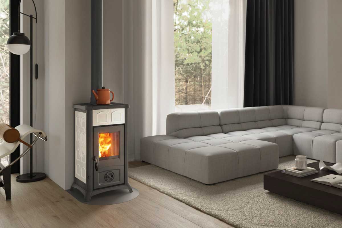 Der Gemma ist ein zeitloser, eleganter Kaminofen mit niedrigen Emissionen – ideal für umweltbewusstes Heizen. Seine Tür aus Gusseisen verformt sich im Laufe der Zeit nicht und garantiert eine konstante Abdichtung. Die Verkleidung besteht aus hochwertigen Keramikfliesen.