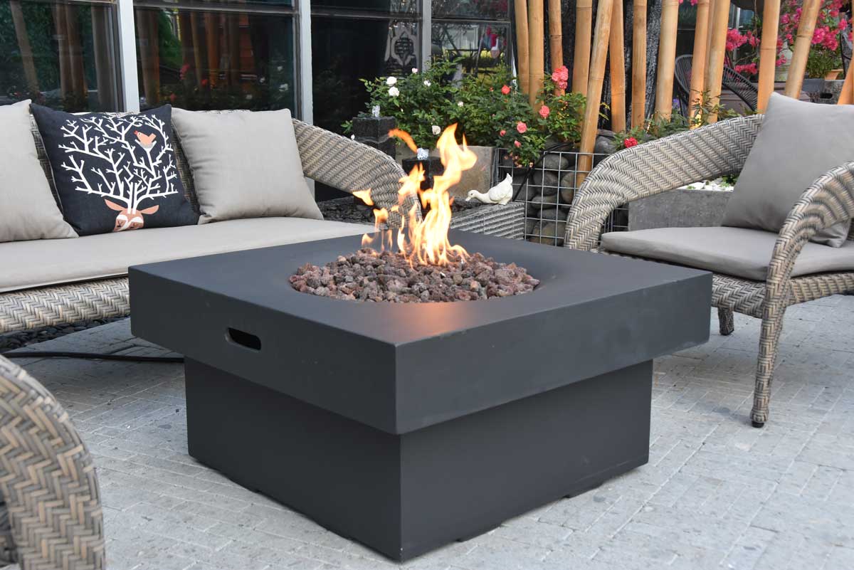 ECHTES FEUERSPIEL AUF KNOPFDRUCKGasfeuerstelle Branford aus der Modeno-Serie, Beton-Optik schwarz, Faserbeton inkl. Druckminderer, Anschlußleitung und Lavasteine rötlich, Anschluss an externe Gasquelle. Die hochwertige Brenneinheit aus Edelstahl ist sehr elegant in der Mitte der Feuerstelle eingebunden, ohne einen Metallrand. Somit lässt sie sich sehr gut durch die dekorativen Lavasteine bedecken, was dem Feuer einen natürlichen Effekt verleiht.