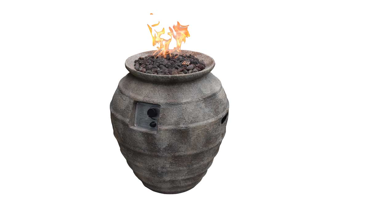 ECHTES FEUERSPIEL AUF KNOPFDRUCKGasfeuerstelle Katla aus der Modeno-Serie, Antik-Keramik-Optik Faserbeton inkl. Druckminderer, Anschlußleitung und Lavasteine rötlich, Anschluss an externe Gasquelle