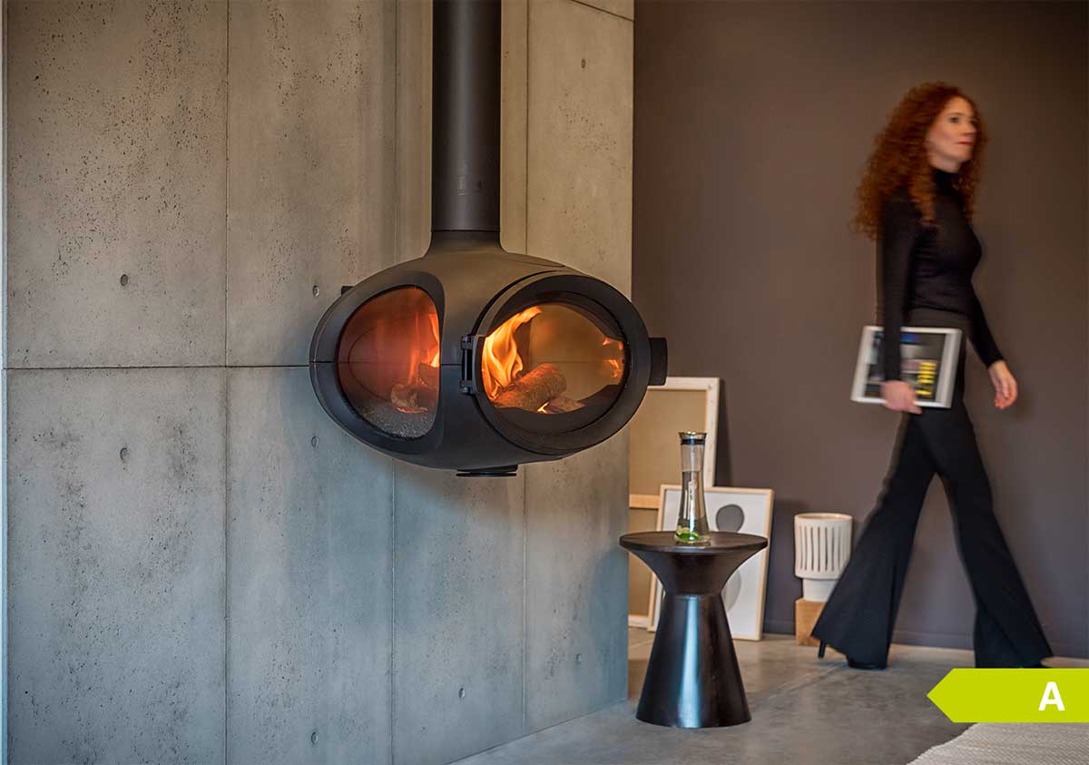 Der Mata ist ein außergewöhnlicher Kaminofen, der mit seiner raffinieren Wandmontage und dem dreiseitigen Panoramafenster ein echter Blickfang ist.