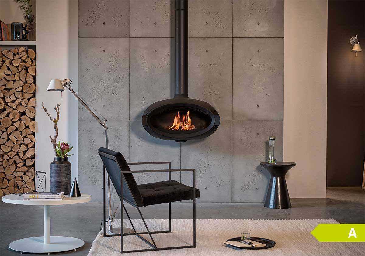 Hängekamin-Design: Der Mata schwebt wie ein Kunstobjekt an der Wand und setzt pure Eleganz in Szene.