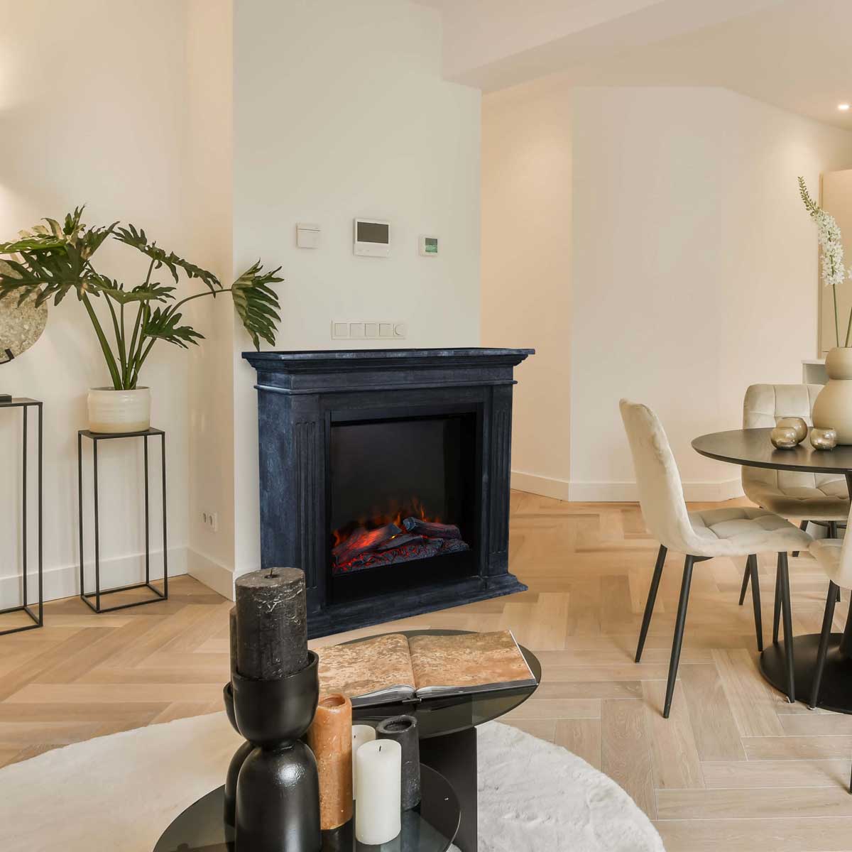 Im Herzen des Kamins sorgt das Levico-70-Elektrofeuer für ein beeindruckend realistisches Flammenbild. Mithilfe von LED-Beleuchung entsteht ein täuschend echter Feuereffekt – völlig ohne Feuer, Ruß oder Geruch. Der Flammeneffekt ist einstellbar und es lässt sich bei Bedarf ein Heizgebläse zuschalten.