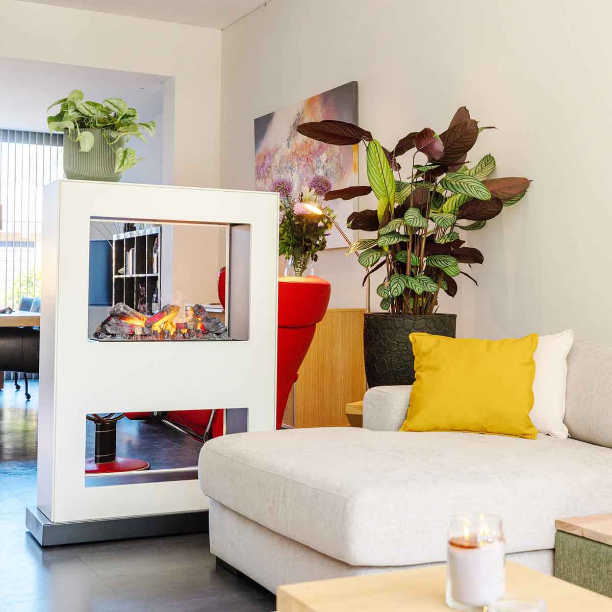 Ein Tunnelkamin oder Sichtkamin ist von beiden Seiten schön anzusehen. Ein idealer dekorativer Kamin, um einen Raum in verschiedene Atmosphären zu unterteilen. Platzieren Sie das Feuer für zusätzliche Wärme in der Nähe oder stellen Sie es beiseite, wenn viele Besucher da sind.