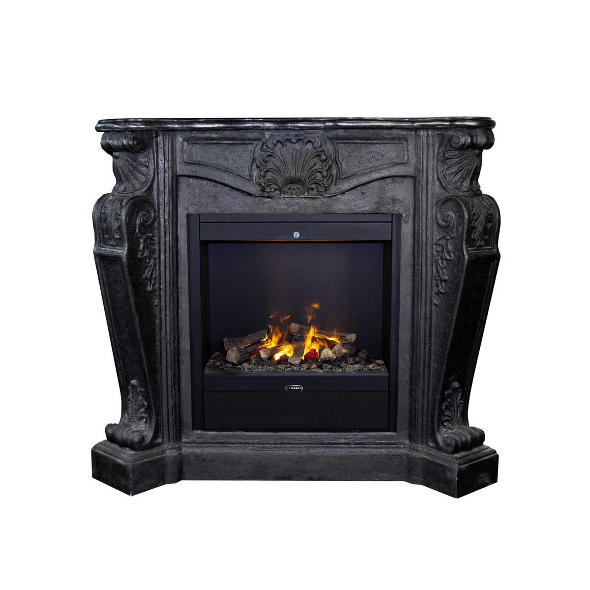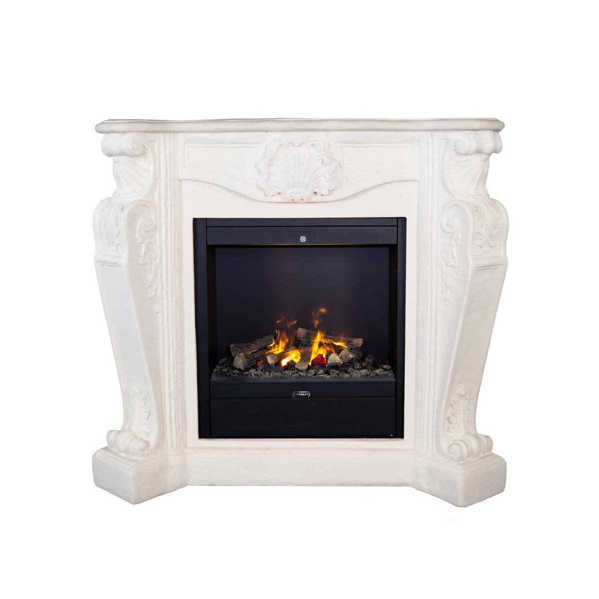 Der Louis-Kaminkorpus besticht durch seine klassische und elegante Ausstrahlung. Das Design ist reich verziert mit kunstvollen Ornamenten im Reliefstil. An beiden Seiten befinden sich geschwungene Säulen mit floralen Mustern und geschwungenen Verzierungen. Über dem Feuerraum thront ein auffälliges zentrales Element in Muschelform, das dem Ganzen eine barocke Optik verleiht. Diese Kaminverkleidung ist ideal für klassische oder romantische Einrichtungen und wird garantiert zum Blickfang im Raum.