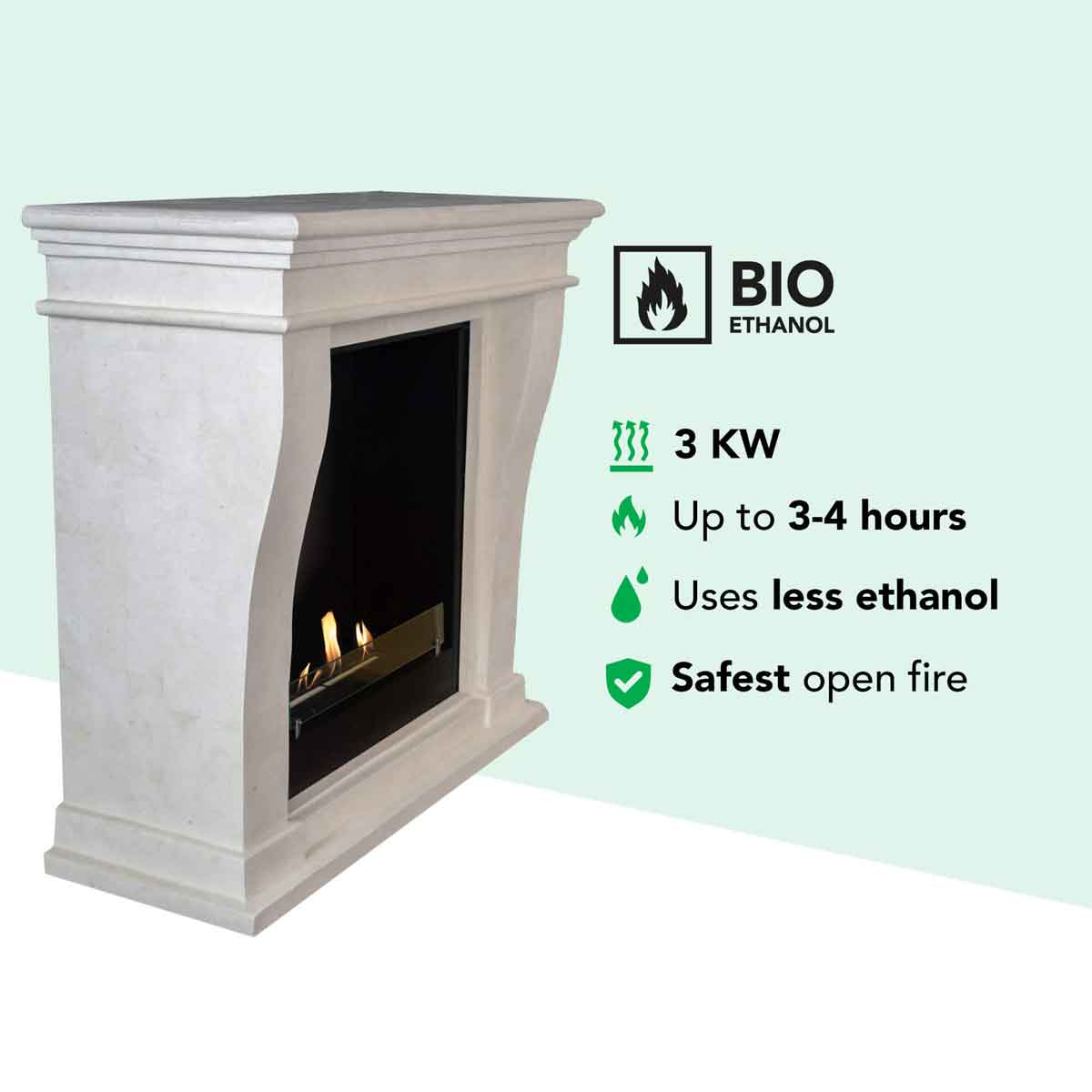 Natürliches Feuer – ganz ohne Rauch oder StromDer Bioethanoleinsatz mit Einbaubrenner L mit Steindekor erzeugt echte Flammen durch die Verbrennung von Bioethanol, einem umweltfreundlichen, erneuerbaren Brennstoff. Es entsteht kein Rauch, kein Ruß und kein Geruch, sodass keine Installation eines Schornsteins erforderlich ist.