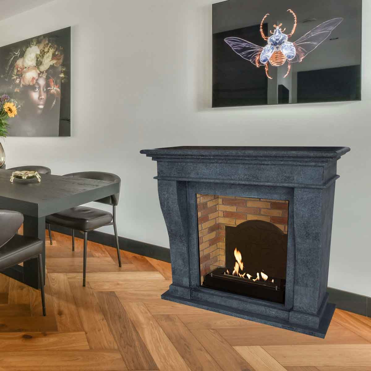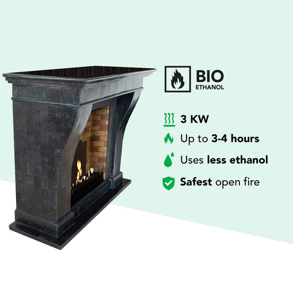 Natürliches Feuer – ganz ohne Rauch oder StromDer Bioethanoleinsatz mit Einbaubrenner L mit Steindekor erzeugt echte Flammen durch die Verbrennung von Bioethanol, einem umweltfreundlichen, erneuerbaren Brennstoff. Es entsteht kein Rauch, kein Ruß und kein Geruch, sodass keine Installation eines Schornsteins erforderlich ist.