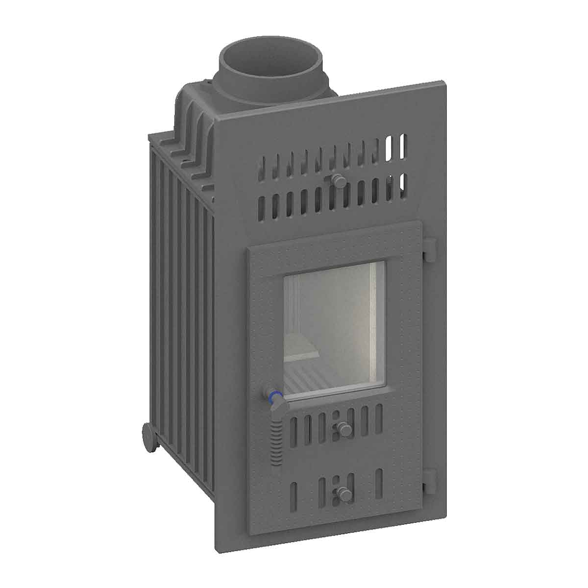 Camina & Schmid fireboxes are equipped with a cast iron secondary air rear wall, through which the combustion air is supplied for improved combustion. The combustion gases are directed to the tips of the flames. The cast iron back panel also supports the side bricks of the inner lining.