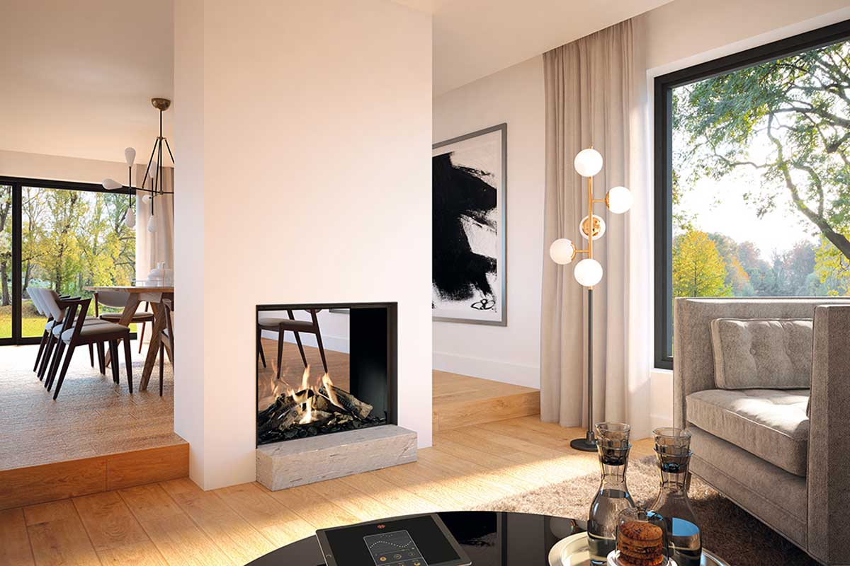 Maestro 75 Tunnel is a tall, slim ‘transparent’ gas fire that is visible from both sides. This makes it a spectacular room divider for a dining room, living room, kitchen or even a conservatory. Maestro 75 Tunnel has black side walls and Dynamic Flame Burner®.