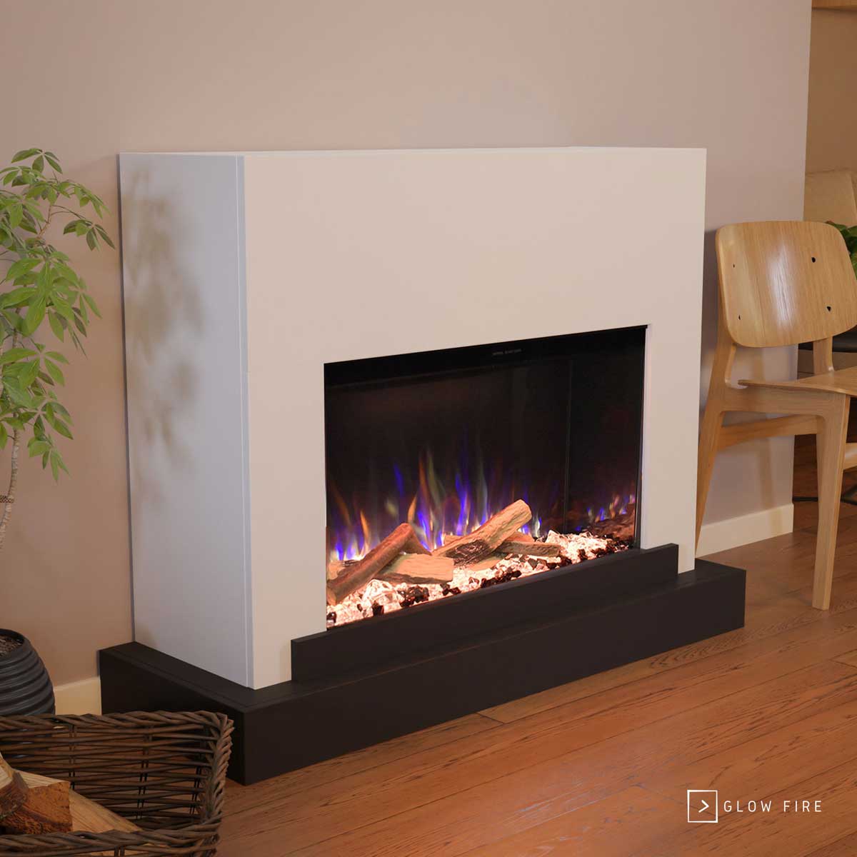 The Glow Fire PR4 electric fireplace is equipped with E-Motion 3D flame technology. The 3-dimensional fire looks absolutely realistic like real fire thanks to the depth image. Create your own fire image using 3 different decorations and different ambient lighting for the fire. The crackling effect makes the fire illusion perfect. The heater with integrated thermostat allows you to set your desired temperature and the fireplace controls the heating automatically. The adjustable timer (up to 7.5 hours) switches the fireplace off automatically.