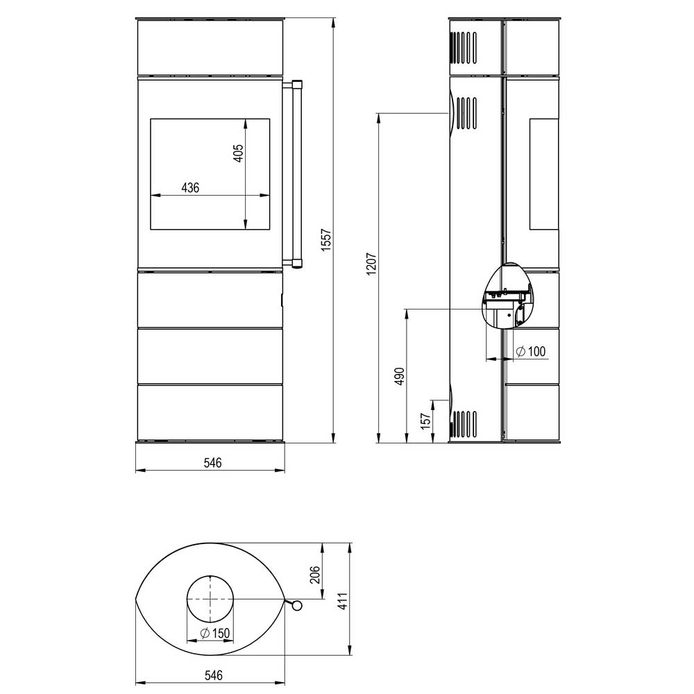 The flue gas connection Ø150mm can be at the back or above, the supply air connection Ø100mm is possible at the back or below.