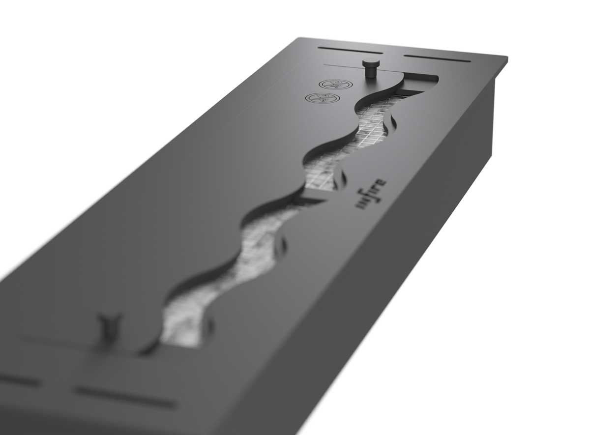 A ceramic fiber insert with mesh increases safety and extends and optimizes the firing process. The sliding bar allows you to adjust the flame size and safely extinguish the fireplace, and the wave shape creates an additional 3D effect.