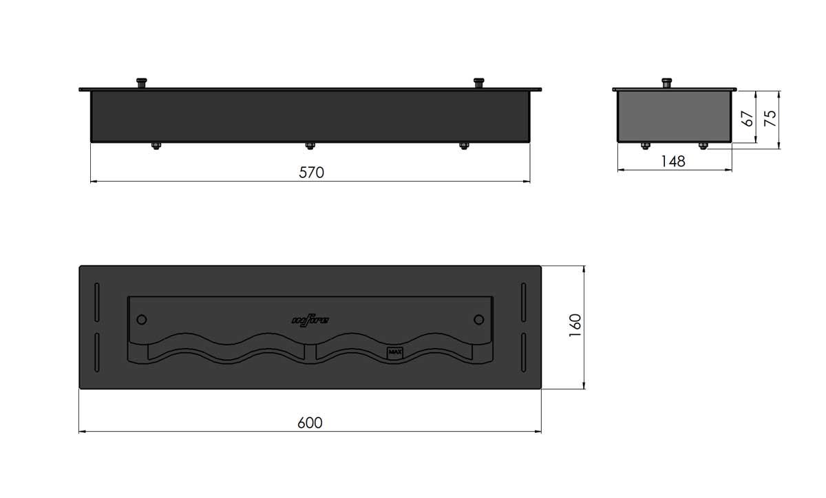 The 600 mm fireplace offers the opportunity to integrate a long and effective fire line into your interior. A simple cutout and an absorbent fiber filling the container allow the fire to burn evenly and stably throughout the burning time.