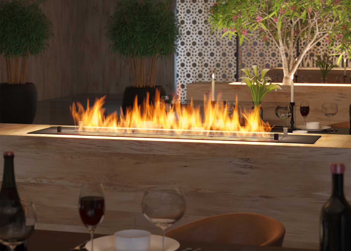 The 1500 mm burner offers the opportunity to integrate a long and effective fire line into your interior. A simple cutout and an absorbent fiber filling the container allow the fire to burn evenly and stably throughout the burning time.