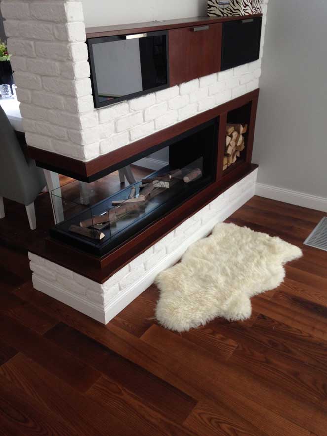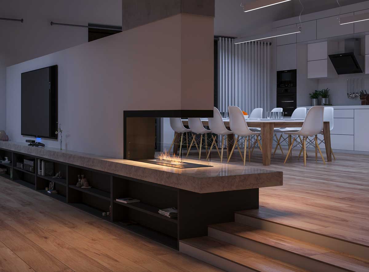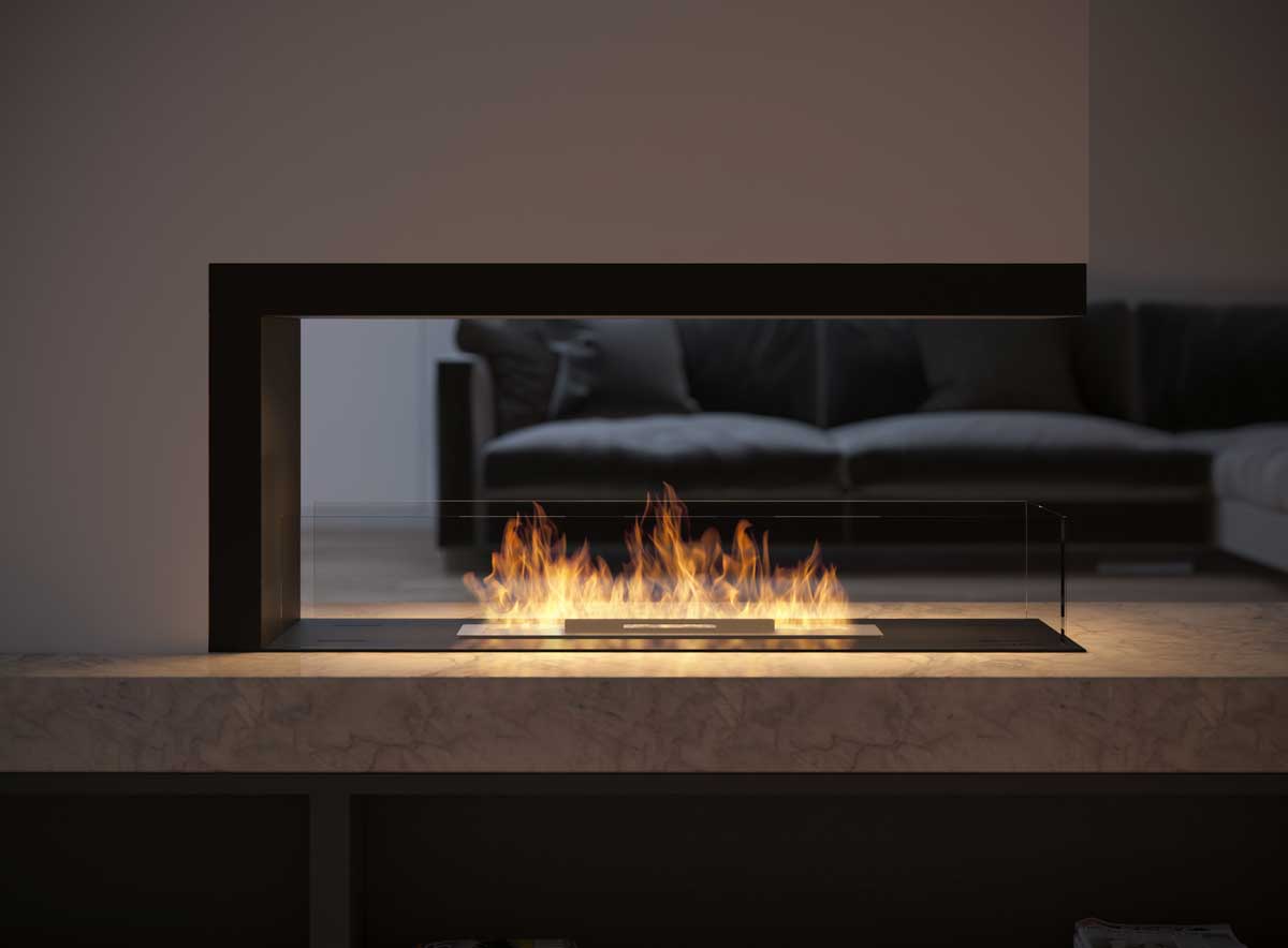 Our fireplaces can be installed anywhere: on (on in) a wall, on the floor, furniture or outside on a terrace for example. Apart from their decorative function, our fireplaces also generate heat, which, as soon as after a few minutes, noticeably increases temperature in the room.