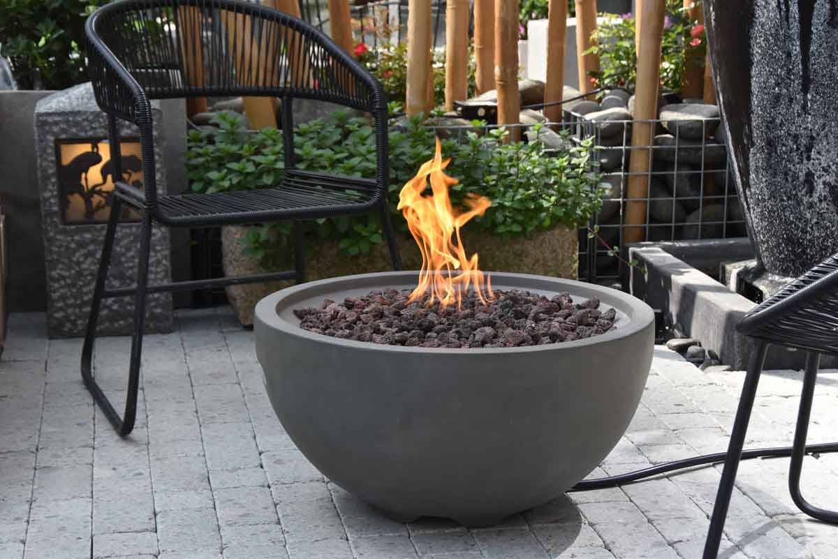 REAL FIRE AT THE TOUCH OF A BUTTONNantucket gas fire pit, concrete look fibre concrete incl. pressure reducer, connection pipe and reddish lava stones, connection to external gas source