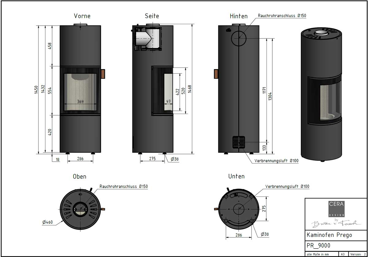 PREGO wood-burning stove – Stylish in a small space.The PREGO stove features a 180° glass pane with a generous view of the fire, yet is only 46 cm in diameter. Whether in a small apartment or a spacious living room, the PREGO stove adapts perfectly and ensures a pleasant indoor climate. With a height of 146 cm for the PREGO and PREGO X, and 163 cm for the PREGO XL, the stove is a true highlight in any room.