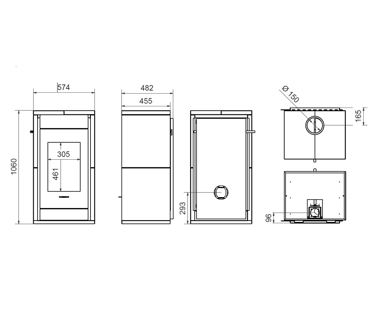 - Large (L) – approx. 149 cm high; additional options: flue pipe connection either at the top or at the rear, e.g., with a 90° bend option for direct chimney connection.
