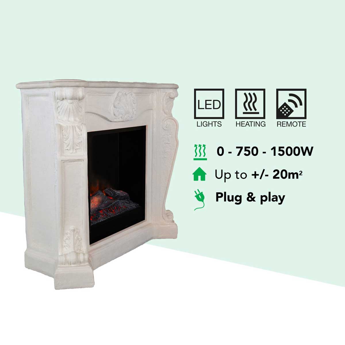 Safety: Overheating protection, child-safe flame effect