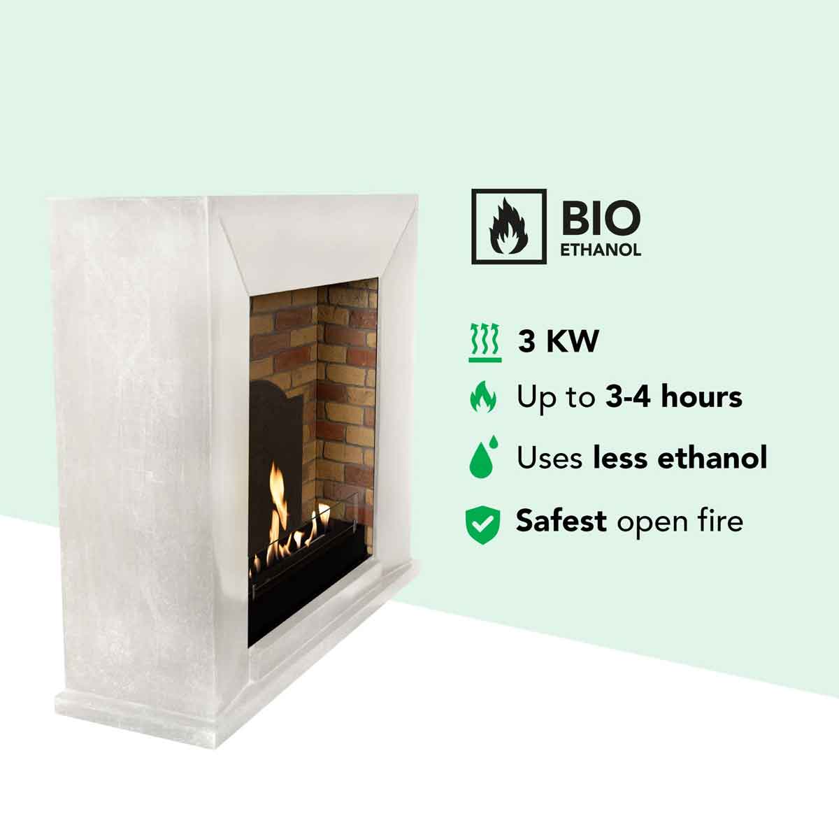 Bioethanol burns without residue, odor, or soot. This creates a cozy, exclusive atmosphere in your rooms with a real fire, completely without smoke or ash.